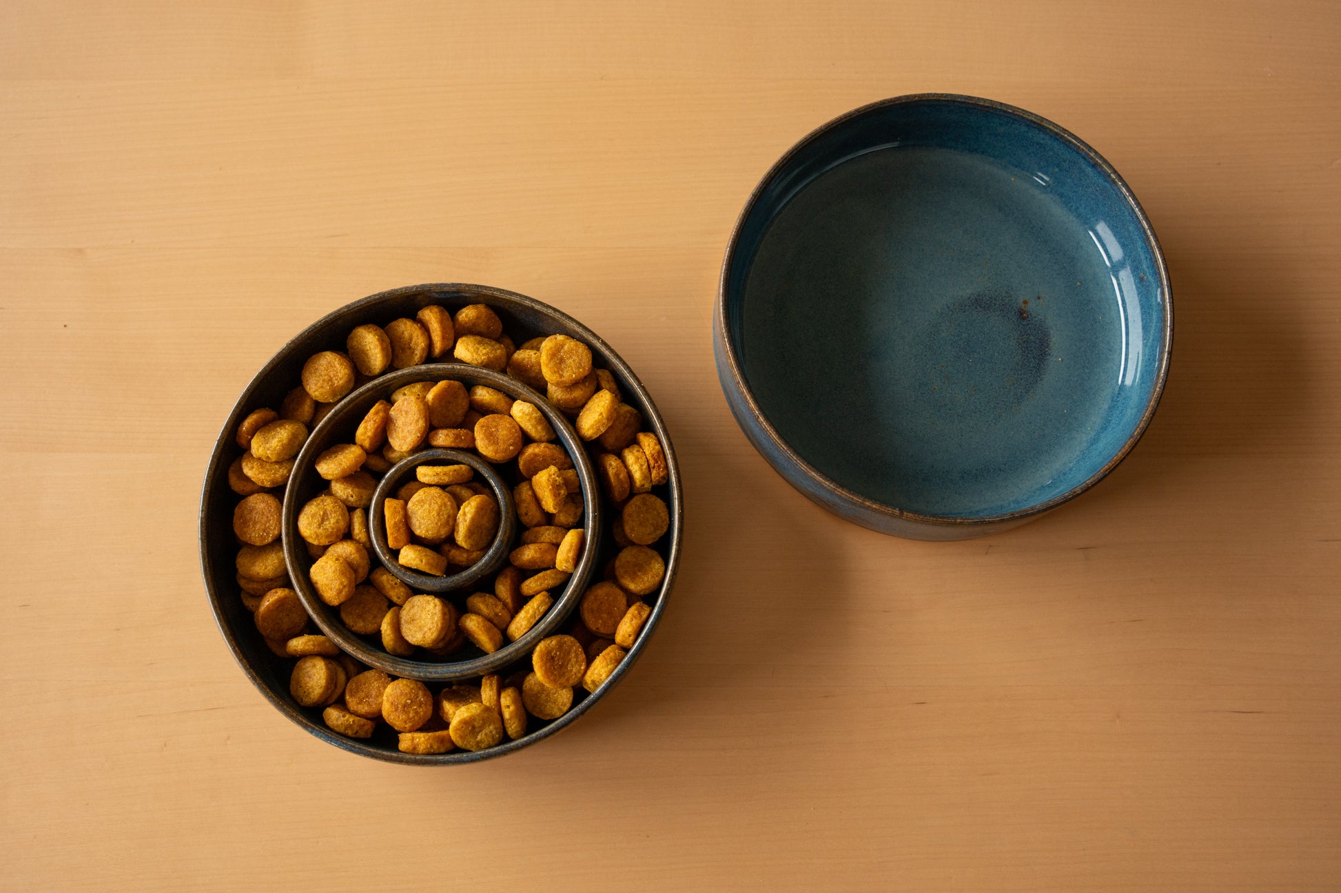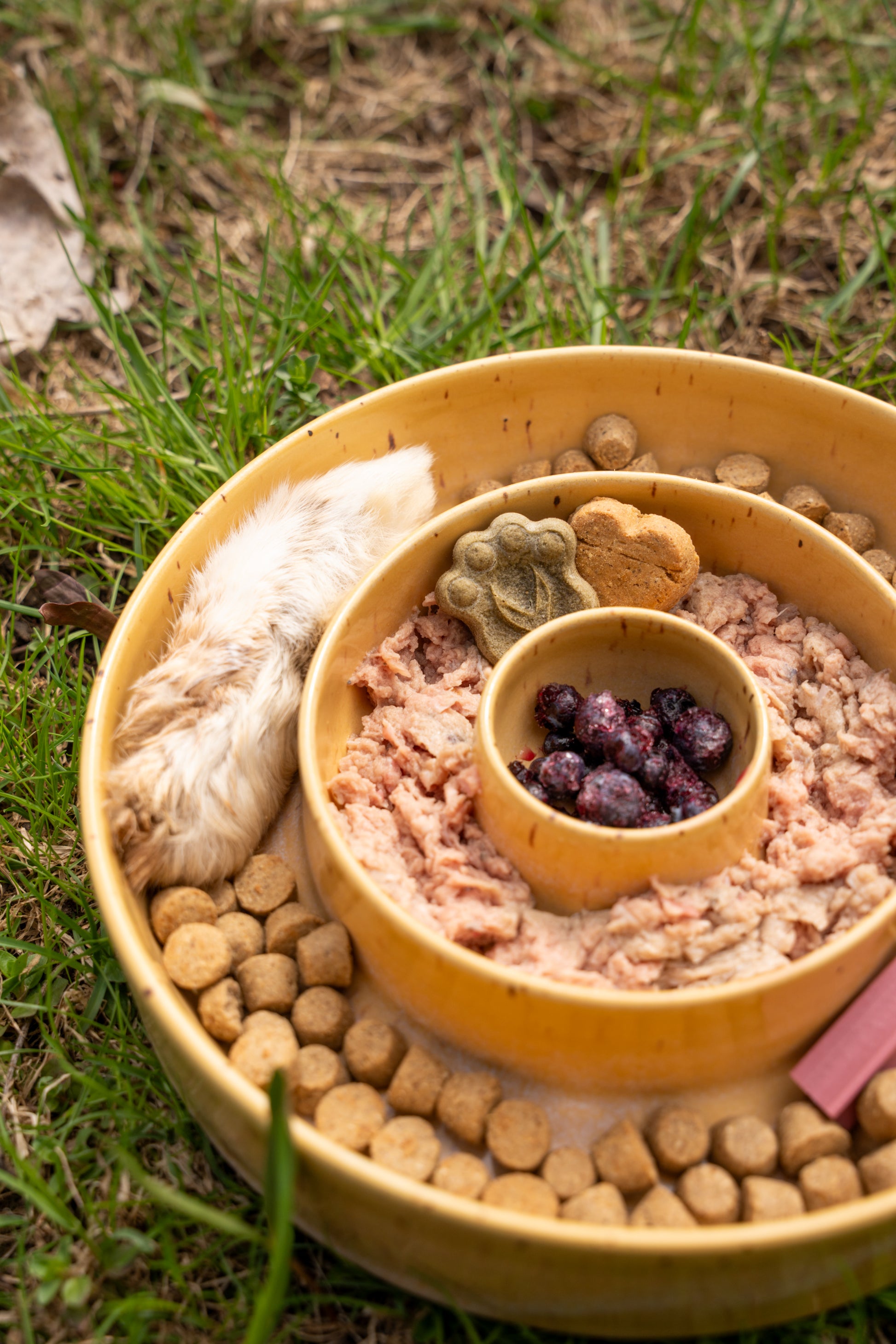 Tips: If you want to stimulate more your dog, you can buy a bigger slowfeeder and add water to the kibbles or the raw food. You can also freeze it.