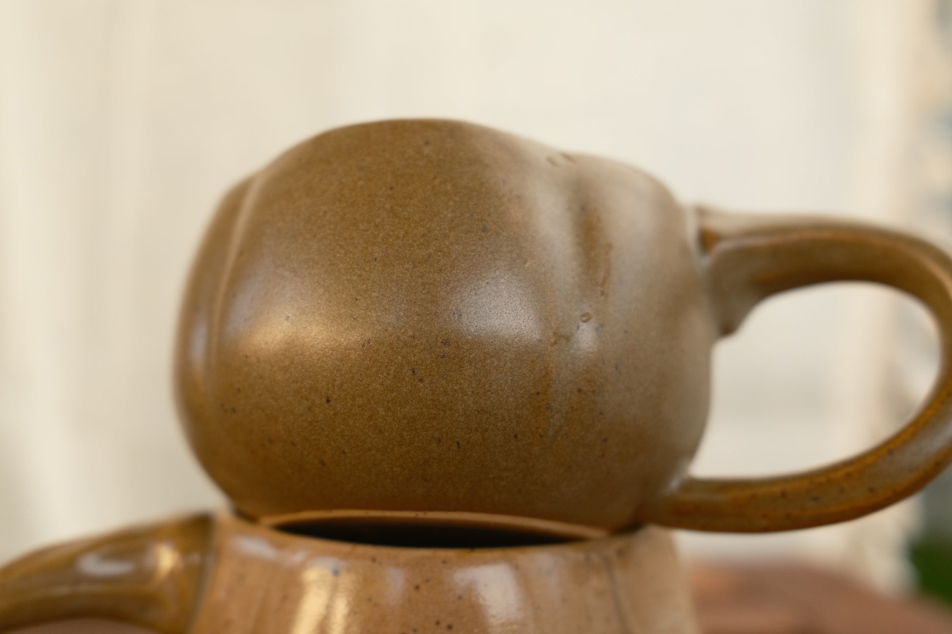 A cozy classic with a natural twist. This handmade ceramic mug is shaped like a plump pumpkin, and its handle is sculpted to resemble the pumpkin’s tail for an organic, lifelike look. The silhouette feels warm and seasonal without being kitschy, making it perfect for daily use from autumn onward.